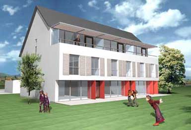 "Dreimaleins" Wohnkonzepte für die Stadt Der Wunsch nach einem eigenen Haus mit Garten, gelegen in urbaner Umgebung mit viel Platz und Mitsprache bei der Gestaltung war Grundgedanke bei der Entwicklung des "Dreimaleins" Hauses: drei eigene Häuser unter einem gemeinsamen Dach. Das urbane Wohnkonzept als Alternative zum frei stehenden Einfamilienhaus und dem klassischen Reihenhaus ermöglicht außerdem durch den Einsatz moderner Technologien und bewährter Verfahren die Realisierung eines zukunftsträchtigen Gesamtenergie- und Klimakonzeptes, was durch die gemeinsame Nutzung dreier Parteien erst wirtschaftlich wird. Kosten. 225.000.- - 260.000.- Euro ohne Keller und Grundstück Wohnfläche. ca. 195 - 225 qm Wohnfläche pro Haus |