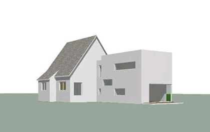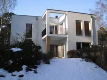 Haus Schilling Aufstockung eines Einfamilienhauses Das Haus Schilling, im Westen Berlins am Wannsee gelegen, befindet sich in direkter Nachbarschaft zu einigen Villen im Bauhausstil der 20er und 30er Jahre. Das bestehende Wohngebäude ist ein freistehendes, einstöckiges Einfamilienhaus mit Walmdach aus dem Jahr 1965. Die Räumlichkeiten im Dachgeschoß ließen sich für die junge Familie nicht mehr optimal nutzten. Zur Vergrößerung des Raumangebots sollte die vorhandene Dachkonstruktion erst vollständig rückgebaut, anschließend um ein weiteres Vollgeschoss aufgestockt werden. Eine klare Fassadensprache und das Flachdach lassen die Villa sich nun optisch in die Nachbarschaft der Bauhausvillen eingliedern. Das sich jetzt modern präsentierende Gebäude erhielt durch die Umplanung nicht nur eine flächenmäßige Aufwertung, vielmehr hat sich der ganze \"Charakter\" des Hauses gewandelt. Großflächige Fenster schaffen lichtdurchflutete Räume, Loggia und Terrassen im Obergeschoss stärken den Bezug zwischen Innen und Außen. Kosten. 190.000.- Euro Nutzfläche. 206qm Fertigstellung. 4/2006 Ort. Berlin-Gatow, Deutschland |